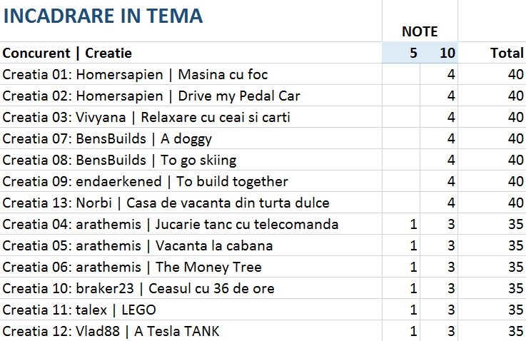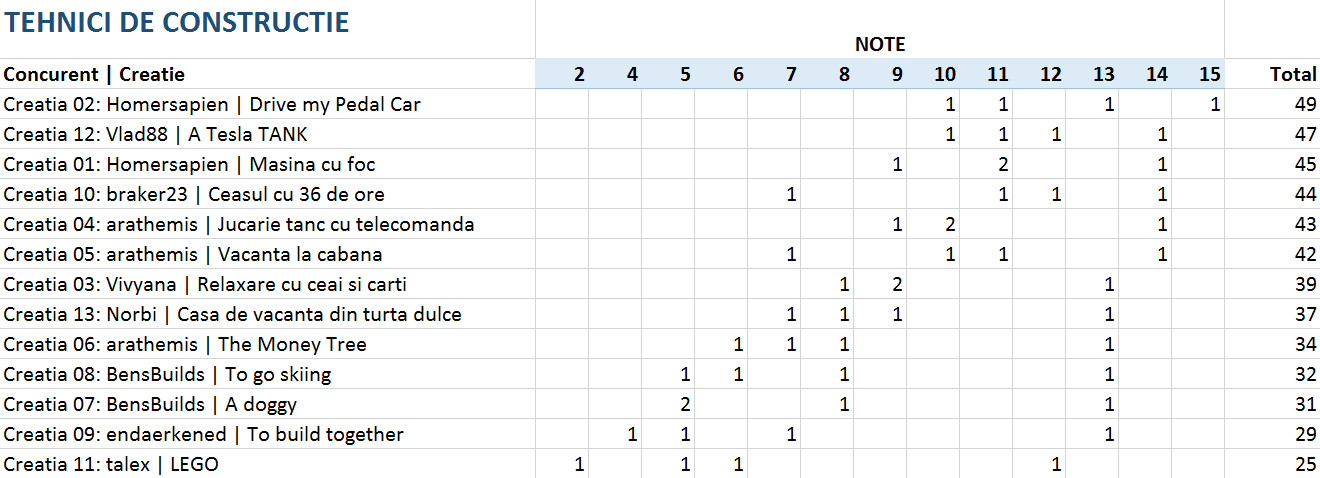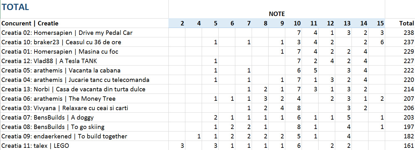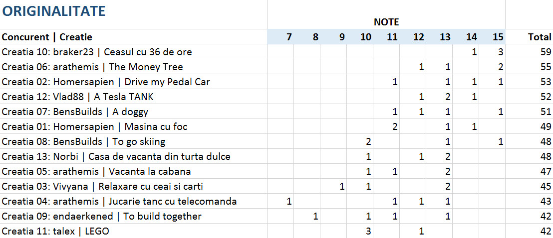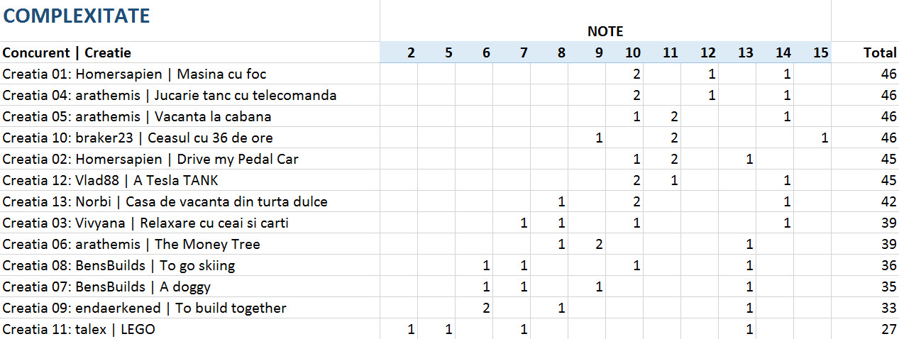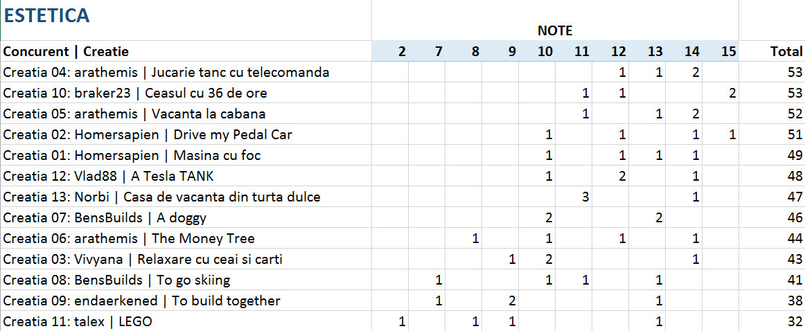 Vedeti mai jos notele acordate la fiecare criteriu in parte, precum si clasamentul final. 4 jurati au acordat puncte intre 1 si 15 pentru originalitate, complexitate, tehnici de constructie si estetica si 5 sau 10 puncte pentru incadrarea in tema.
