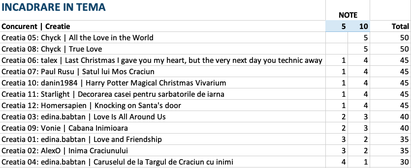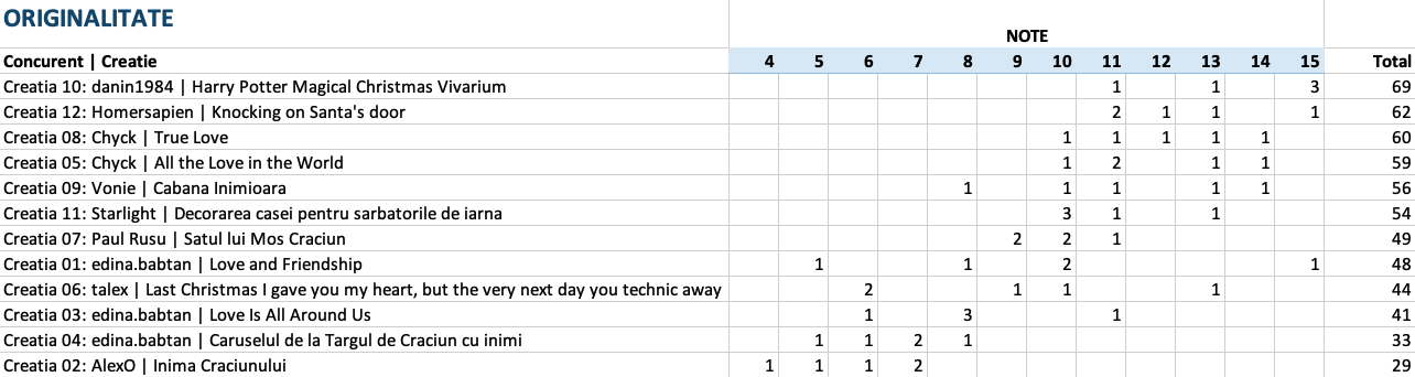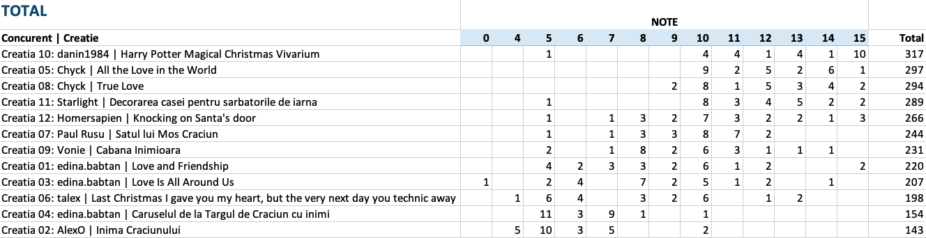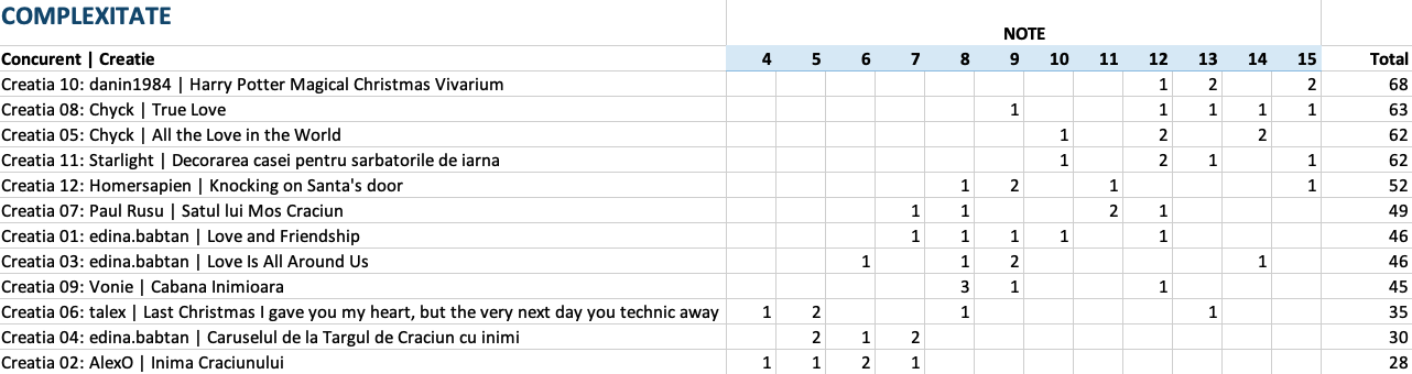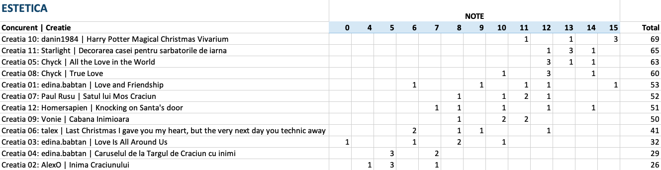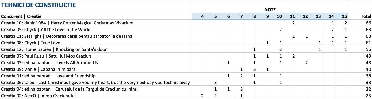 Vedeti mai jos notele acordate la fiecare criteriu in parte, precum si clasamentul final. 5 jurati au acordat puncte intre 1 si 15 pentru originalitate, complexitate, tehnici de constructie si estetica si 5 sau 10 puncte pentru incadrarea in tema.